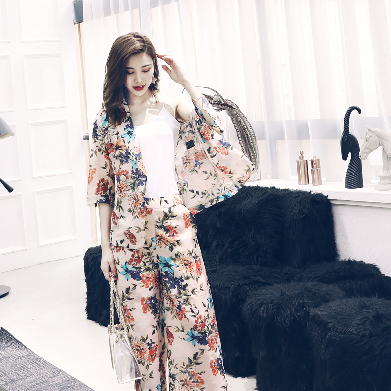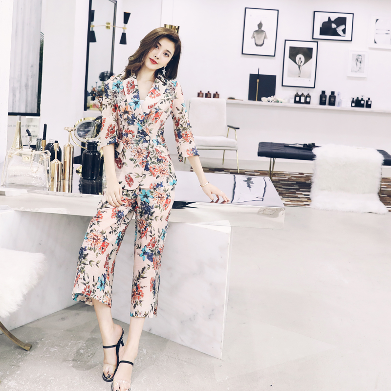 / 歐洲站小西裝女套裝2018新款時尚復古印花西服外套小腳褲時髦套裝