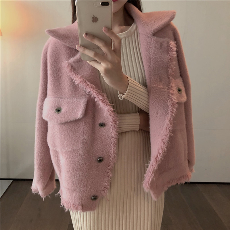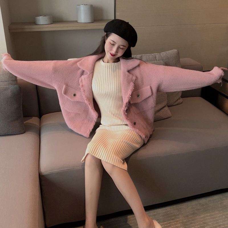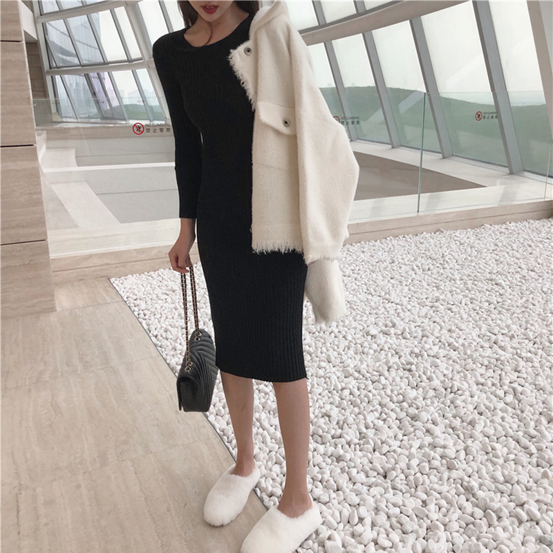 黑色針織連衣裙|卡其色針織連衣裙|粉色仿貂絨外套|白色仿貂絨外套