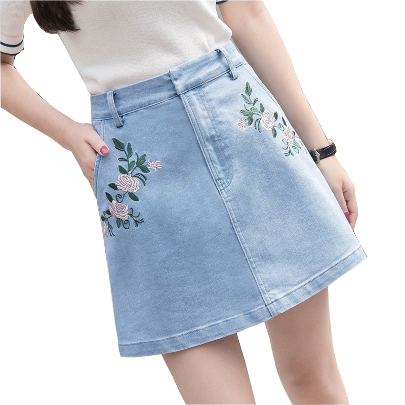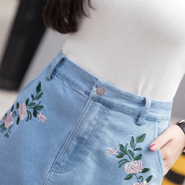 / 高腰牛仔裙半身裙女刺繡A字裙包臀短裙防走光褲裙大碼花朵半裙夏