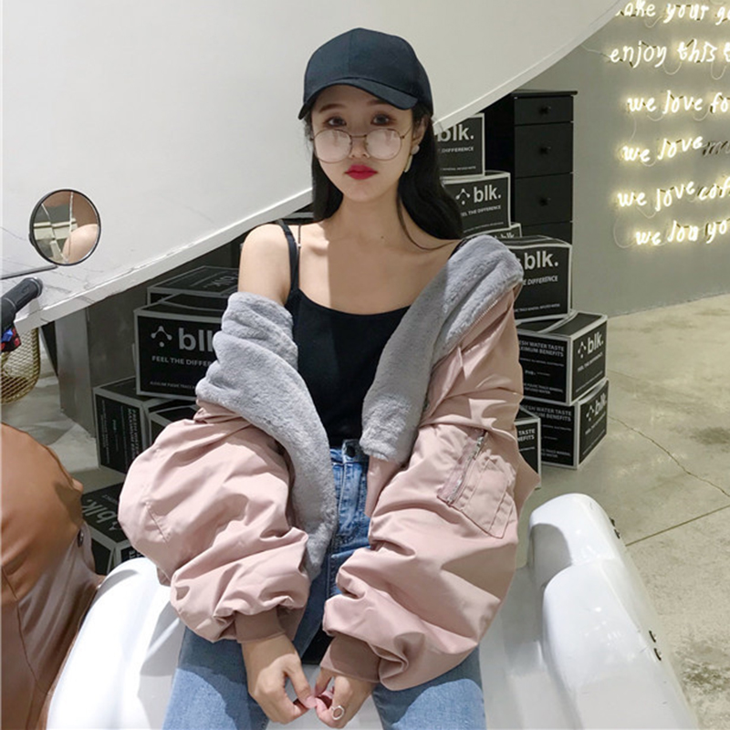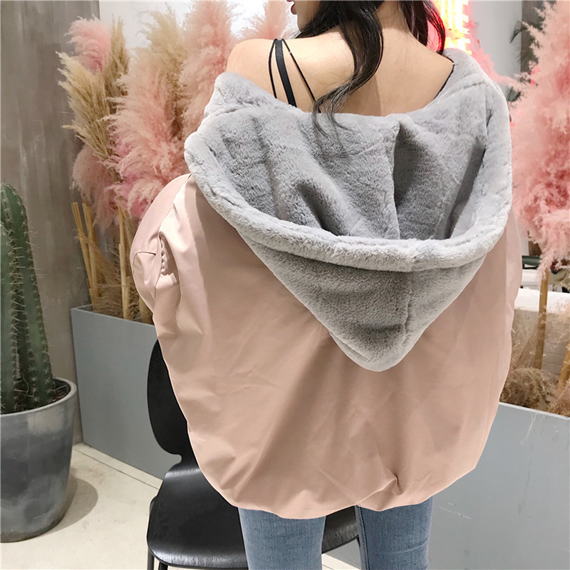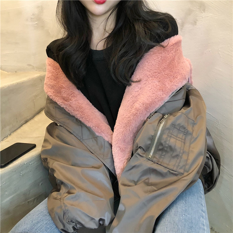 時尚加絨保暖黑色夾克棉服秋冬女裝新款學生寬松長袖棉衣連帽外套