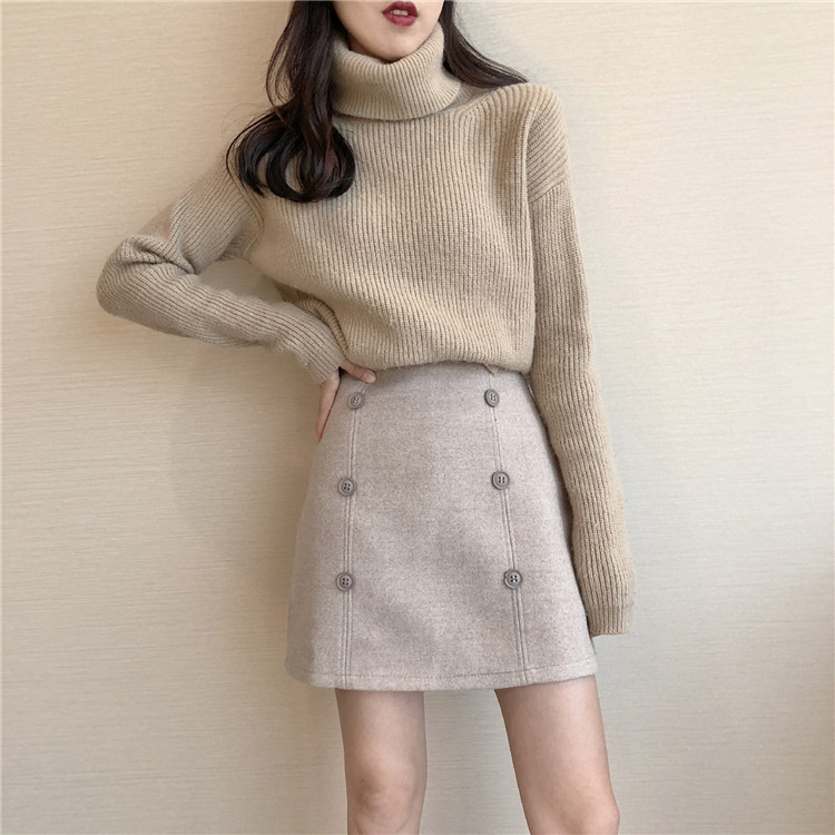 裙子女新款韓版chic港味復古雙排扣純色厚毛呢內襯高腰A字半身裙
