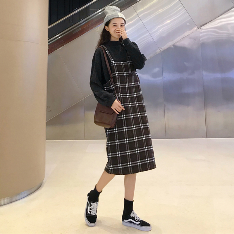 時尚套裝女秋冬2018新款慵懶寬松半高領衛衣復古格子毛呢背帶裙子