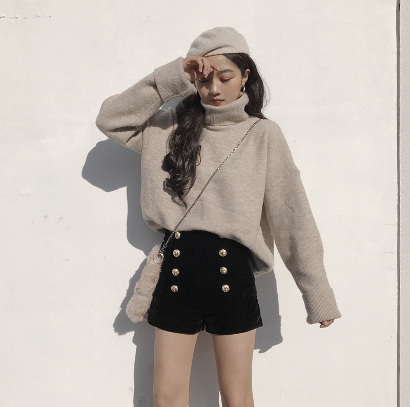 褲子女2018新款韓版百搭高腰時尚港風chic氣質秋季雙排扣絲絨短褲