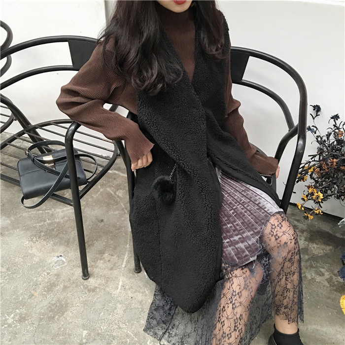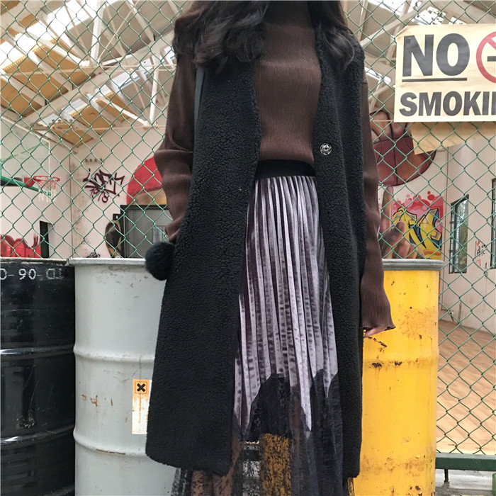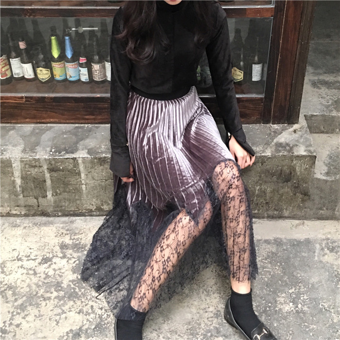 / 韓國chic秋冬款百搭松緊腰絲絨蕾絲拼接中長款壓折半身裙女