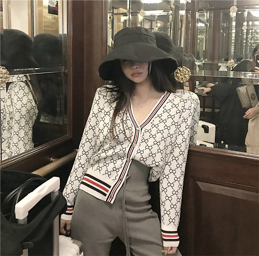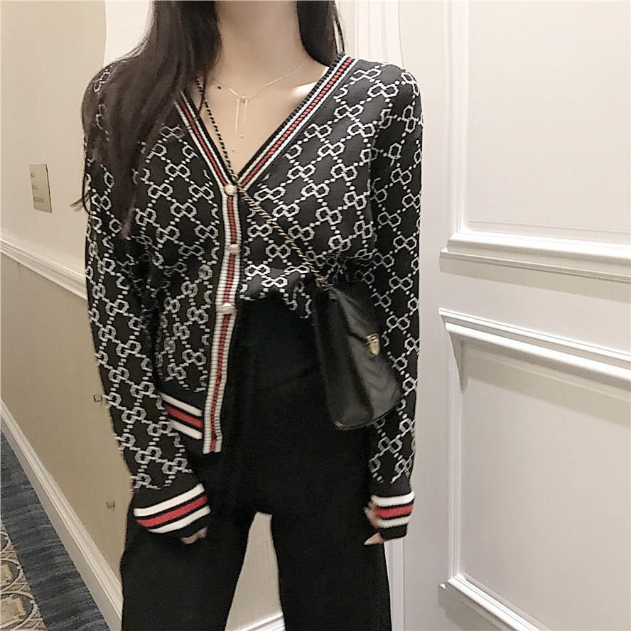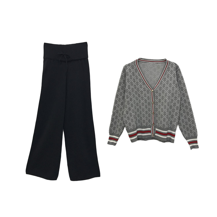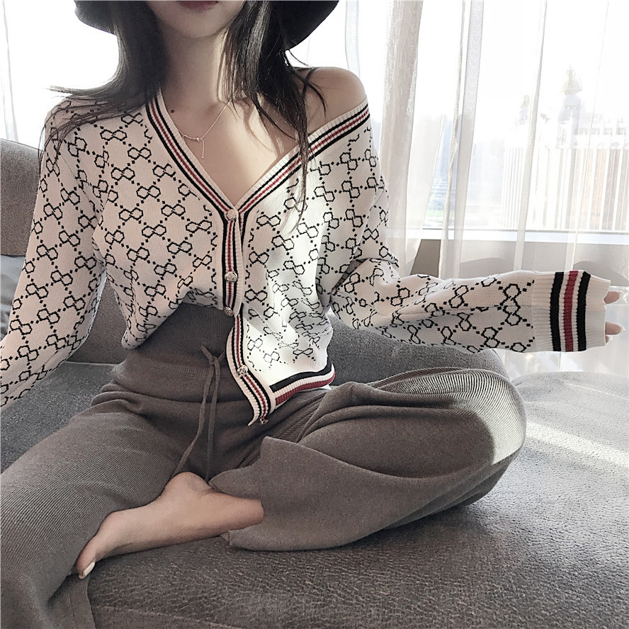 / 韓版網紅同款秋裝女2018新款套裝撞色提花V領開衫小外套+休閑長褲