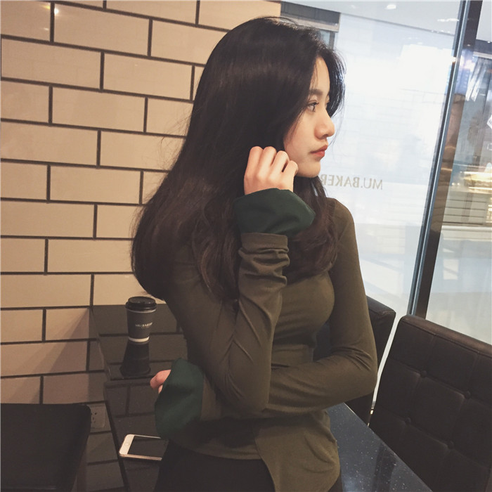 / 秋裝新款韓版上衣女純色T恤修身顯瘦長袖復古百搭荷葉袖打底衫潮