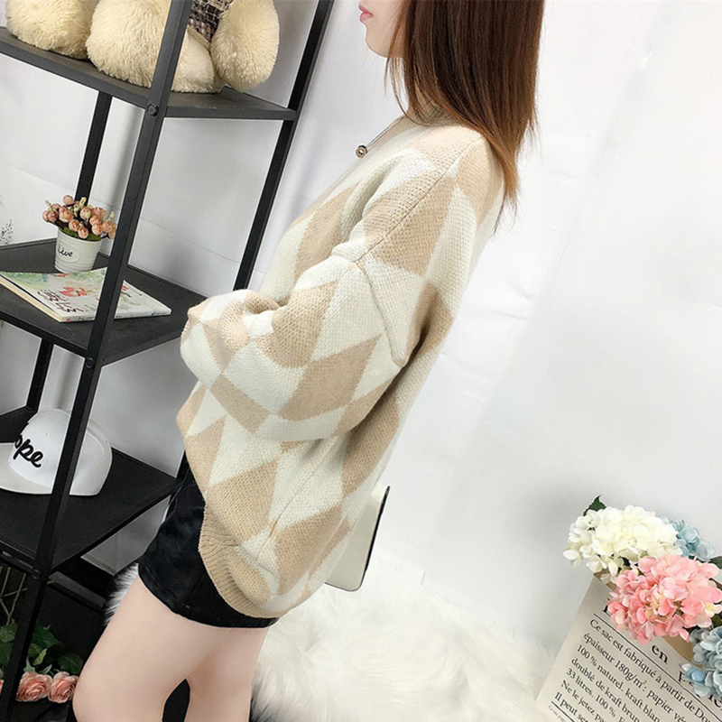 小清新套頭針織衫女秋冬裝2018新款慵懶風寬松撞色菱格毛衣外套潮