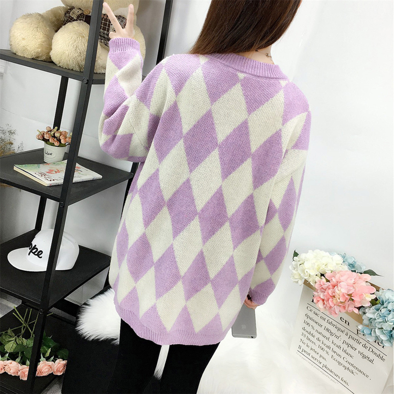 / 小清新套頭針織衫女秋冬裝2018新款慵懶風寬松撞色菱格毛衣外套潮