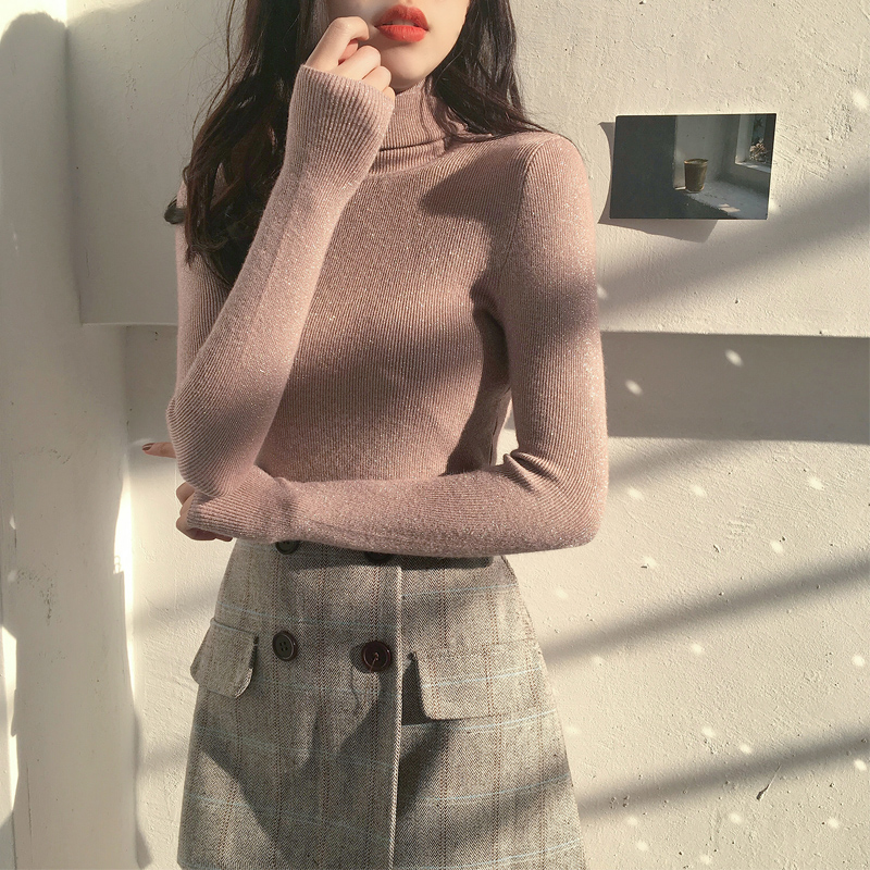 / chic早秋毛衣慵懶風修身顯瘦高領亮絲針織衫女長袖毛衣打底上衣潮