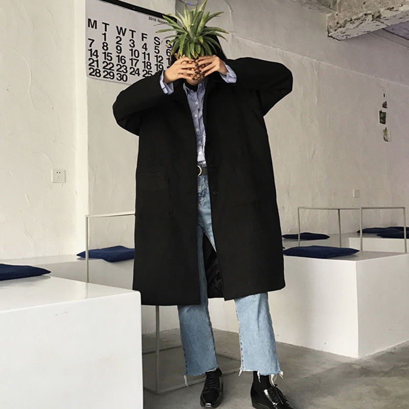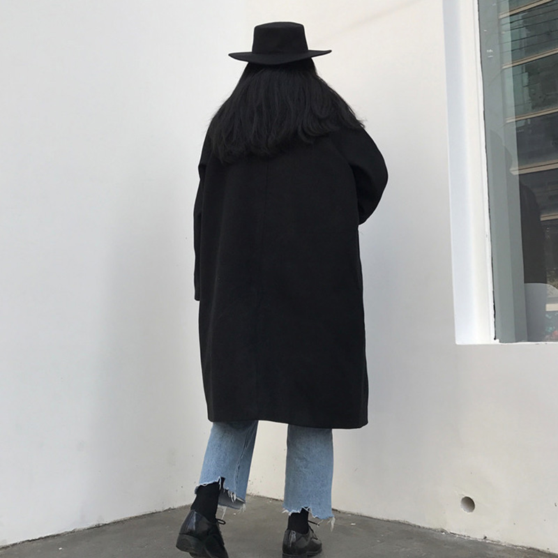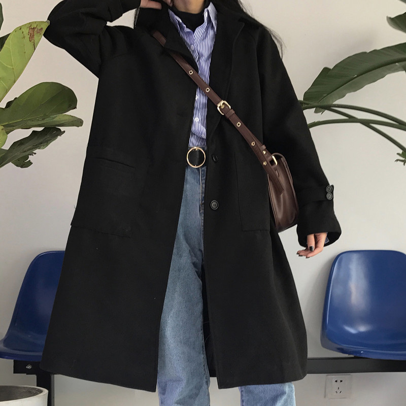 時尚毛呢外套秋女2018新款復古翻領黑色呢子大衣學生寬松長袖上衣