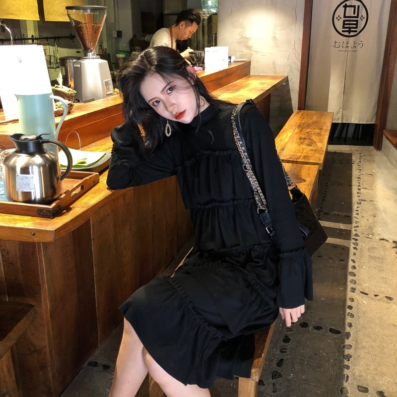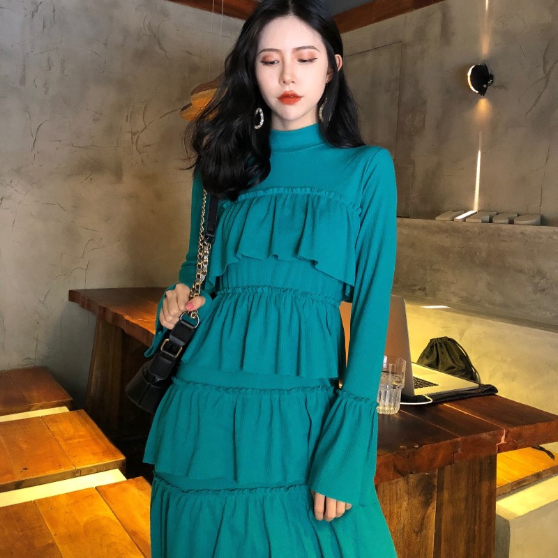 秋裝女2018新款百搭半高領喇叭袖高腰顯瘦蛋糕裙修身長袖連衣裙