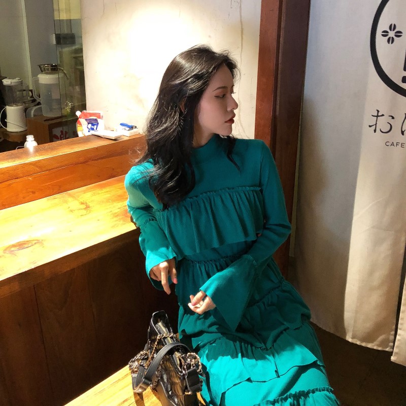 / 秋裝女2018新款百搭半高領喇叭袖高腰顯瘦蛋糕裙修身長袖連衣裙