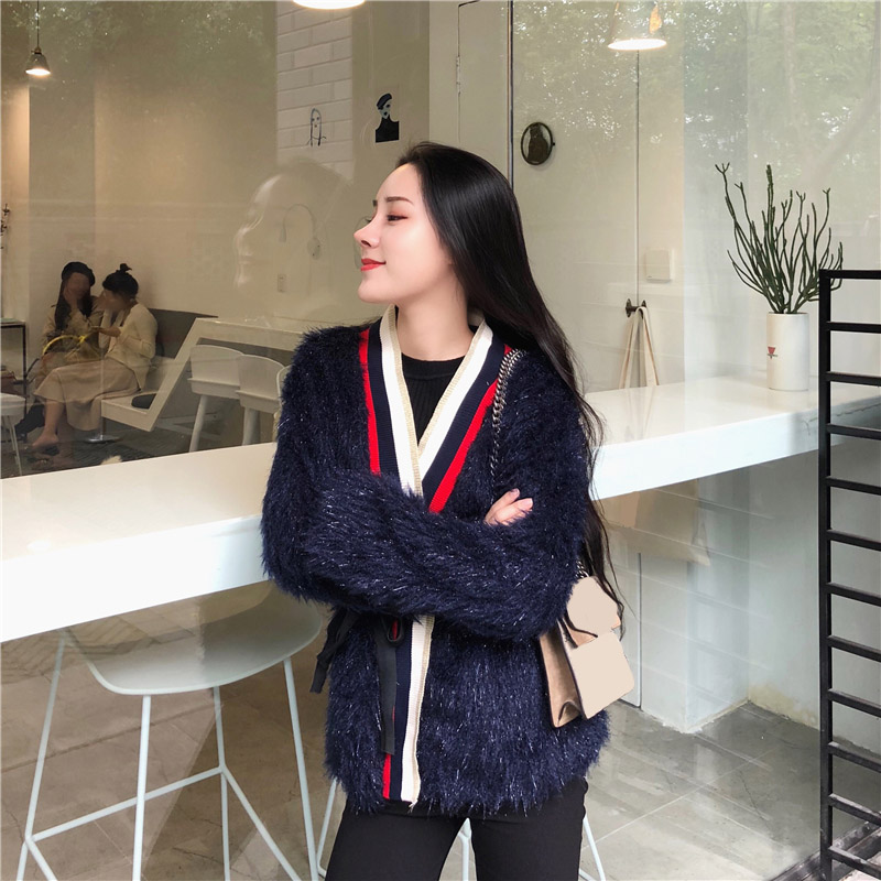 / 韓版chic亮晶晶毛絨新款秋冬時尚百搭寬松顯瘦收腰長袖開衫外套女