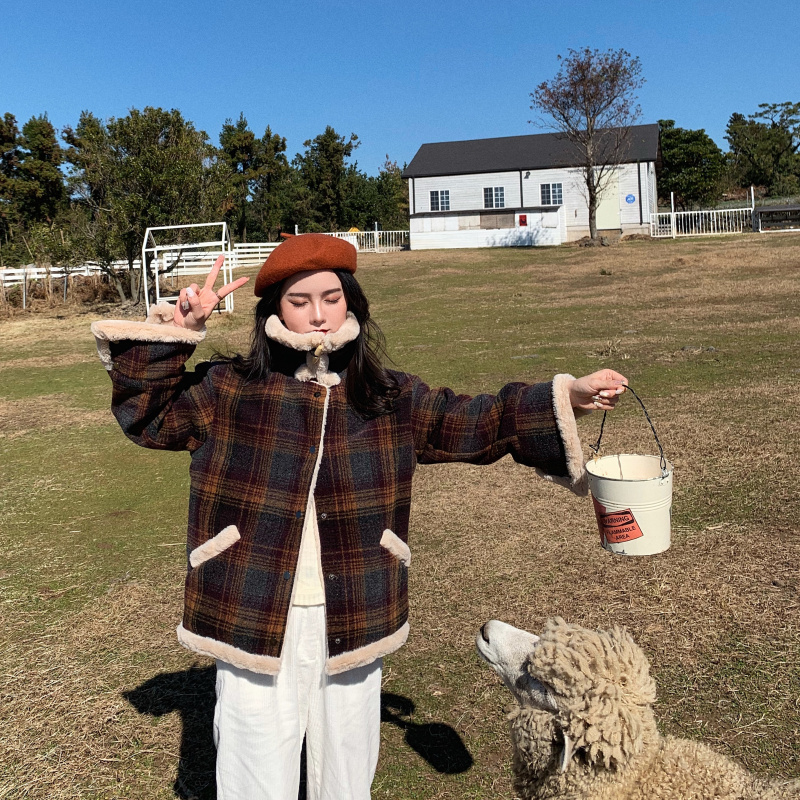 / 新款韓版冬季時尚學生加厚復古chic保暖加絨毛呢子格子短款外套女
