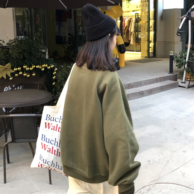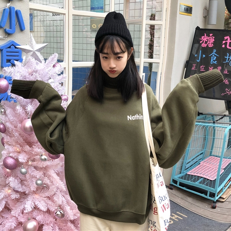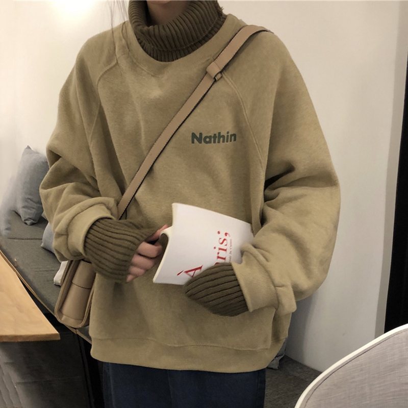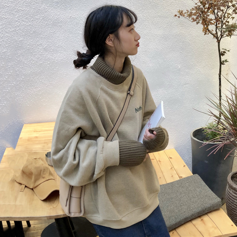 / 秋冬韓版慵懶風復古寬松套頭加絨拼接高領休閑字母長袖衛衣外套女