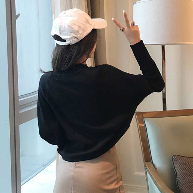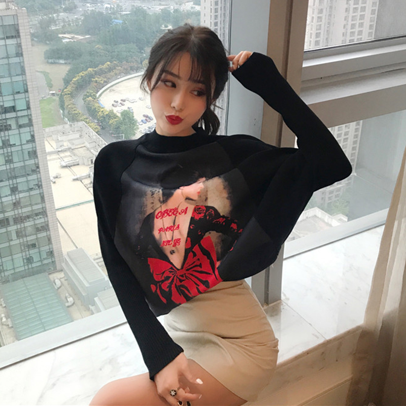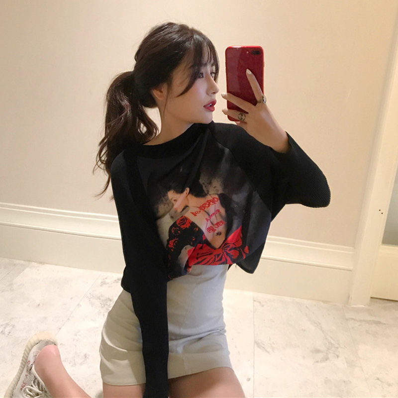 秋裝女裝2018新款寬松顯瘦蝙蝠袖薄款毛衣印花黑色針織打底衫上衣