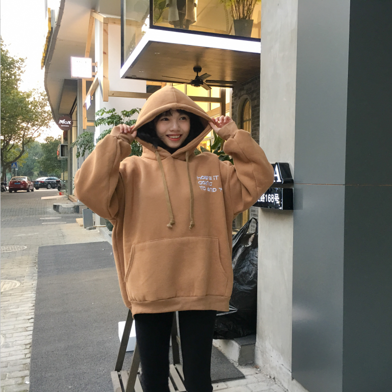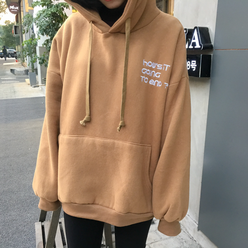 秋冬韓版寬松慵懶風字母繡花連帽加絨加厚套頭超火衛衣上衣外套女