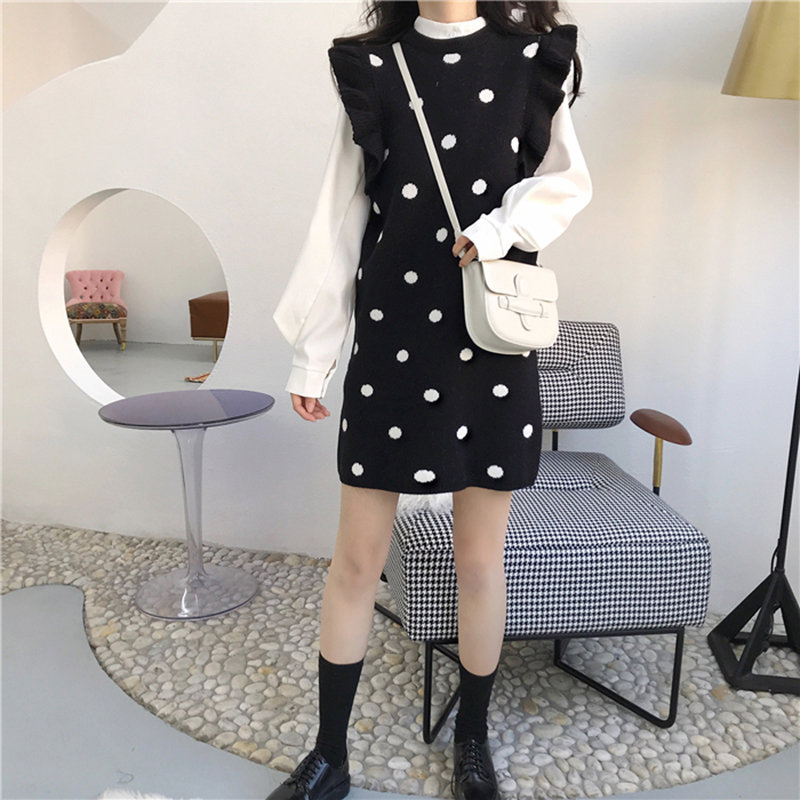 / 套裝女秋冬2018新款寬松立領長袖襯衫木耳邊波點針織背心連衣短裙