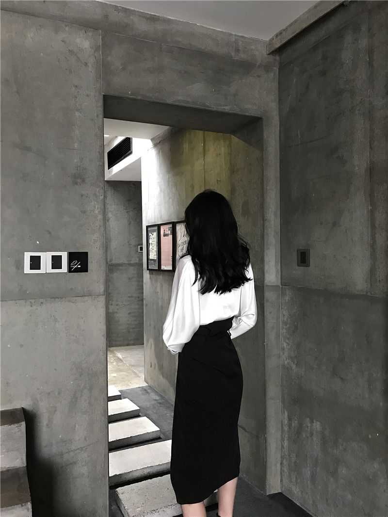 新款性感大v領襯衣復古OL風中長款高腰開叉半身裙兩件套時尚套裝