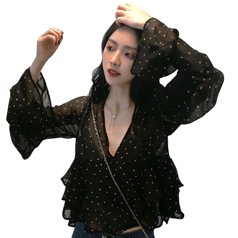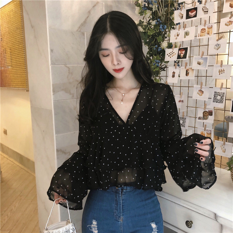 / 韓風chic復古黑色波點V領荷葉袖上衣女顯瘦百搭寬松打底雪紡衫夏
