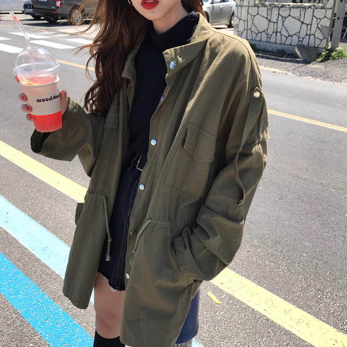 復古韓國oversize寬松蝙蝠袖拉鏈排扣口袋抽繩收腰工裝風衣外套女
