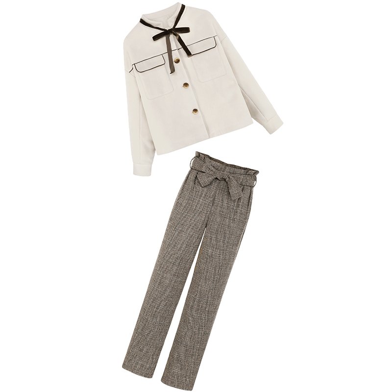 MG小象寬松短外套女冬季2018新款千鳥格休閑直筒褲學生長袖上衣潮