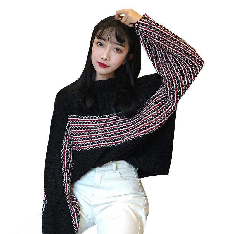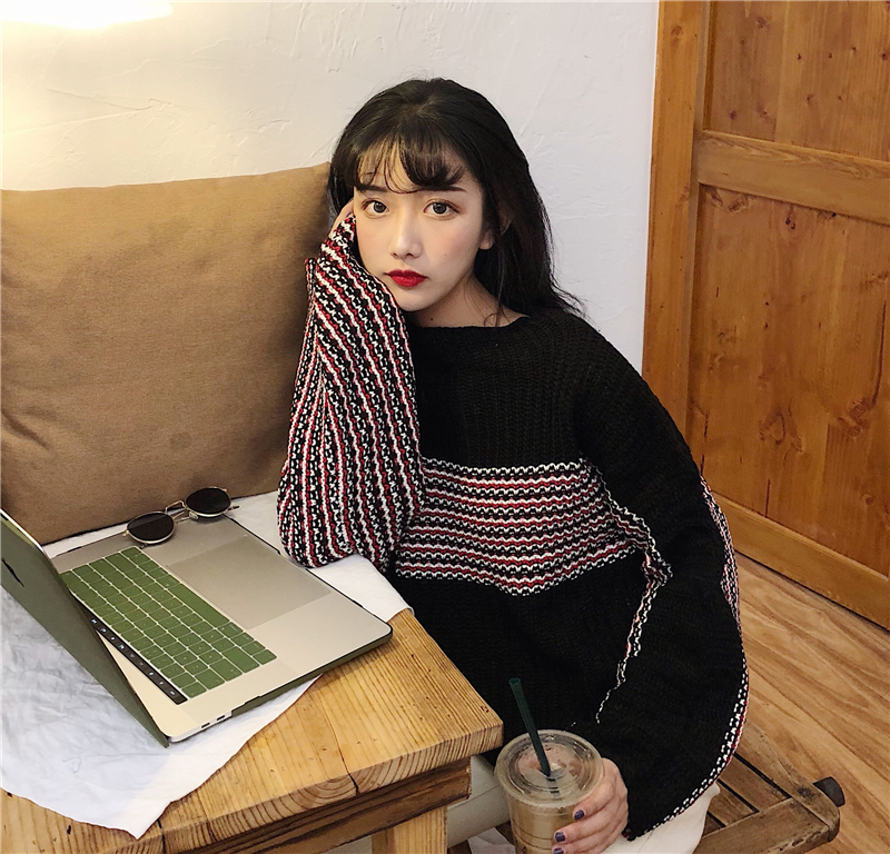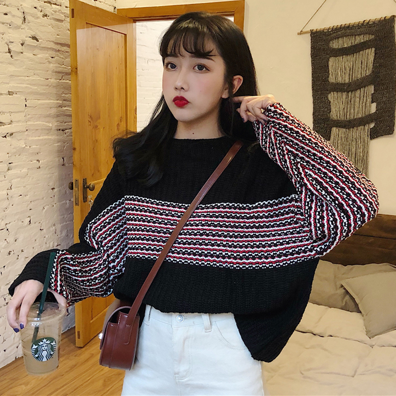 2018新款秋季女裝韓版寬松條紋粗毛線網紅套頭針織衫毛衣上衣外套