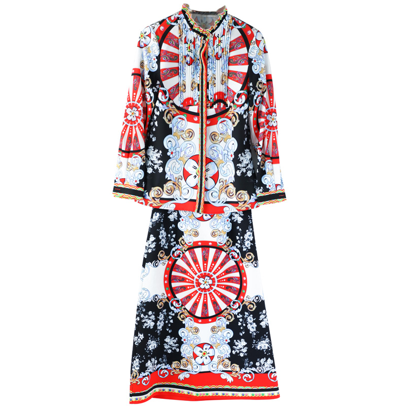 / 名媛氣質秋裝2018新款女裝氣質兩件套長袖襯衫印花裙子長裙套裝潮