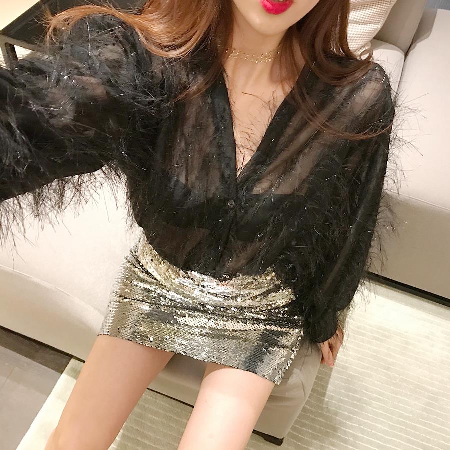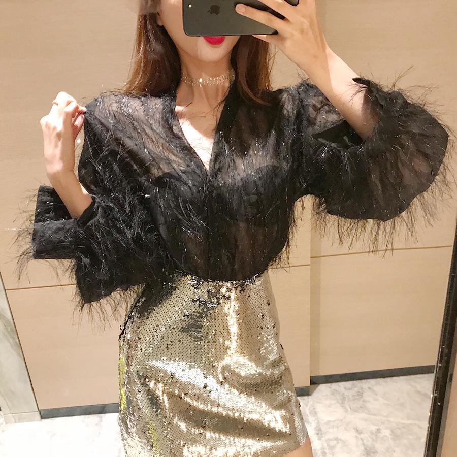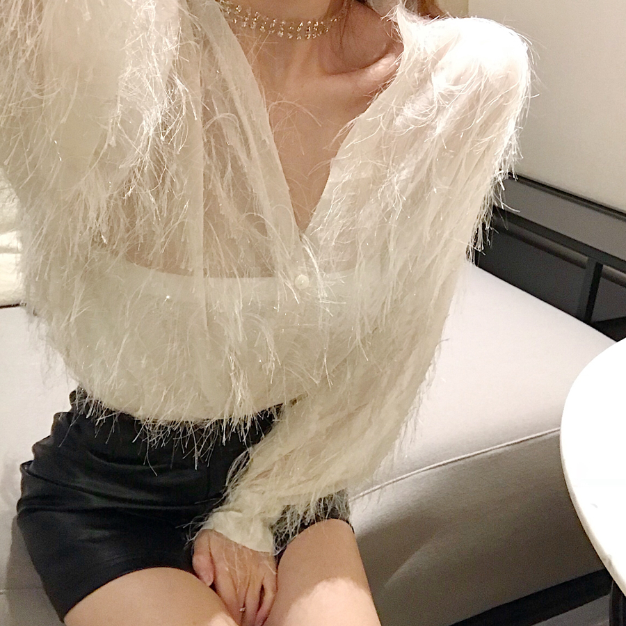 / 2018秋季新款韓范復古chic時尚V領毛毛流蘇蕾絲甜美氣質長袖上衣