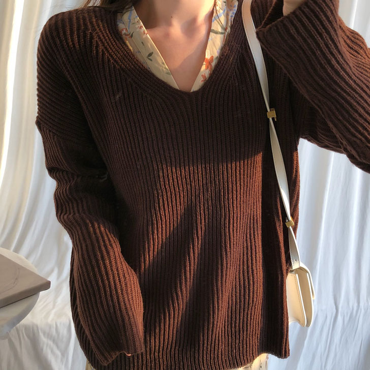 2018秋冬新款V領針織棕色系暖毛衣女軟糯上衣+復古碎花收腰連衣裙