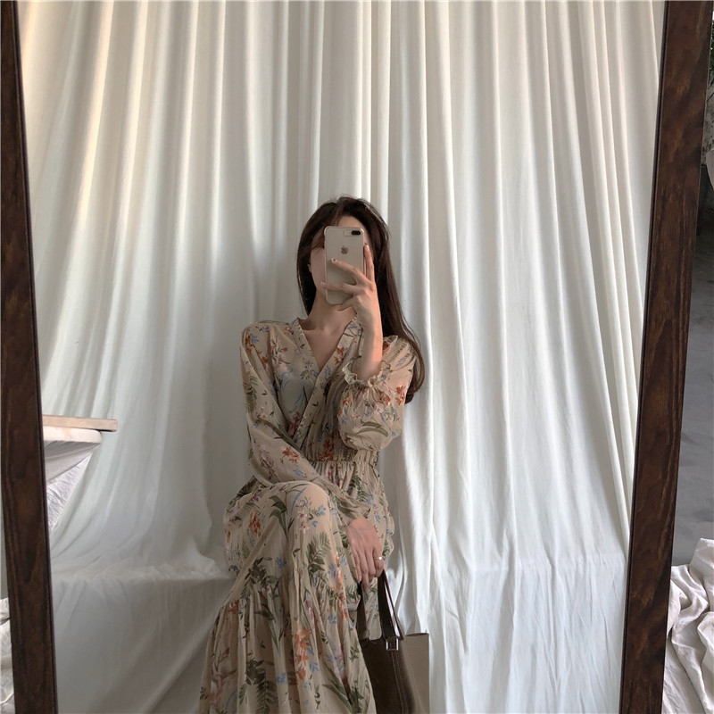 / 2018秋冬新款V領針織棕色系暖毛衣女軟糯上衣+復古碎花收腰連衣裙