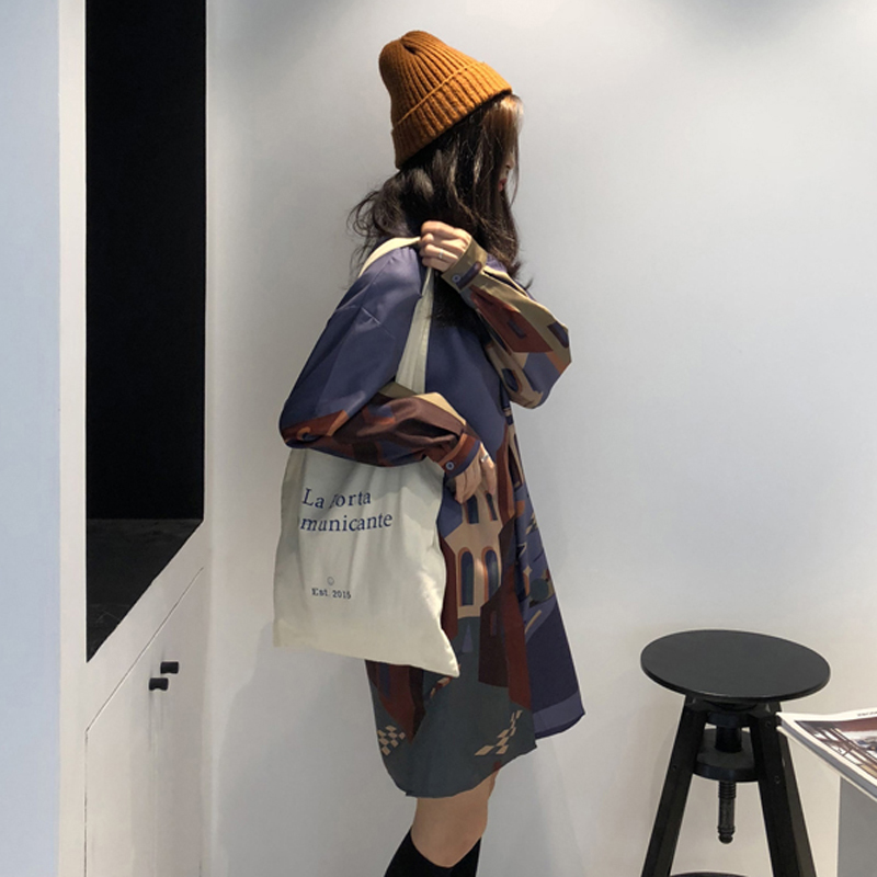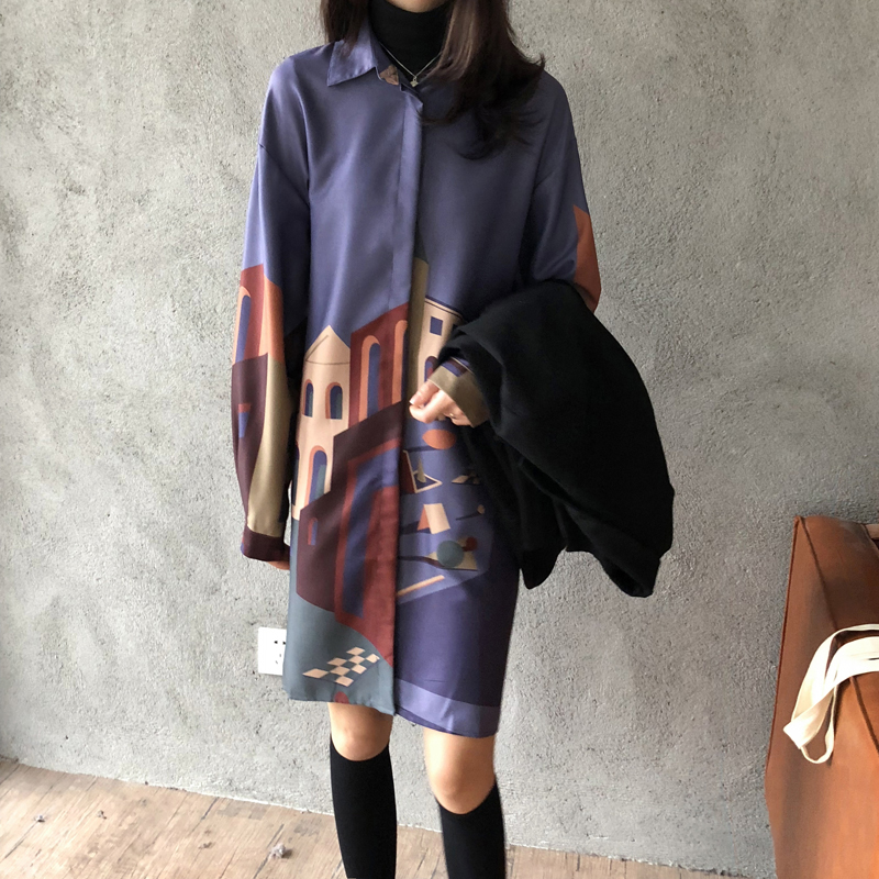 / ins中長款建筑印花襯衫裙女秋冬裝2018新款復古寬松打底連衣裙子