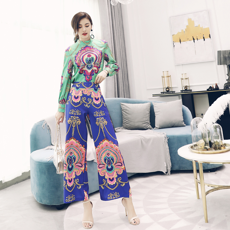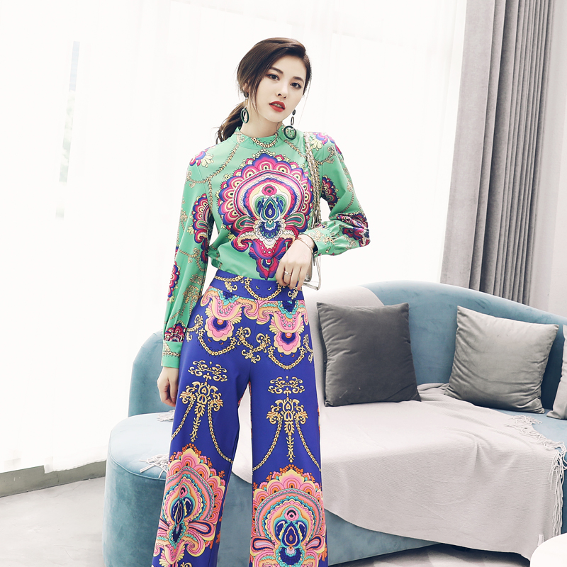 / 時尚秋裝套裝2018夏新款腰帶顯瘦復古闊腿褲港味印花網紅兩件套潮