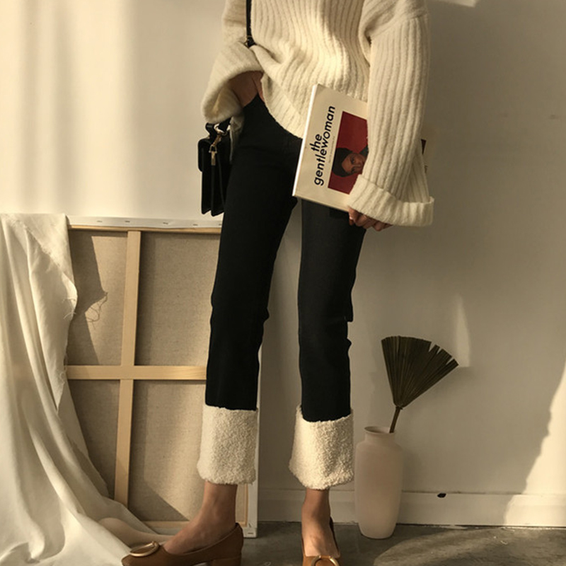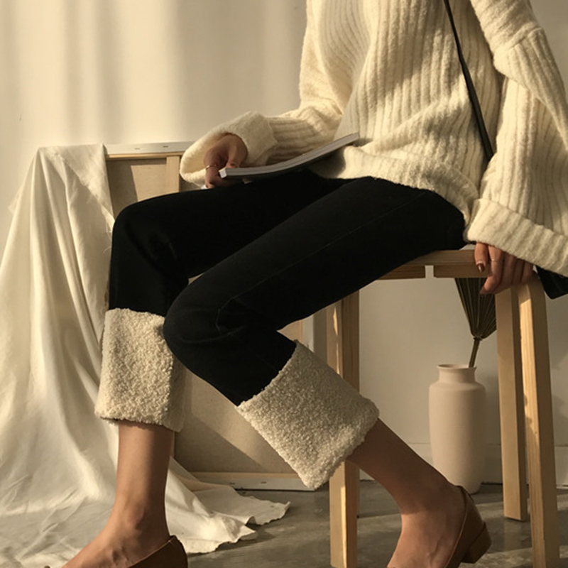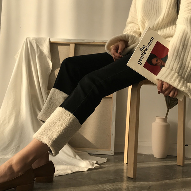 秋冬2018新款女裝韓版高腰彈力九分直筒褲時尚羊羔毛拼接牛仔褲子
