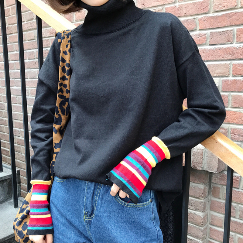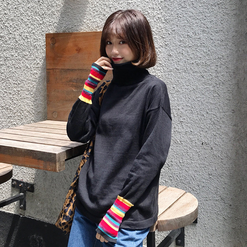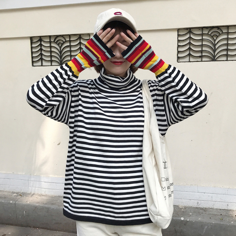 / 毛衣女2018新款秋裝時尚拼色長袖條紋針織衫學生修身高領打底上衣