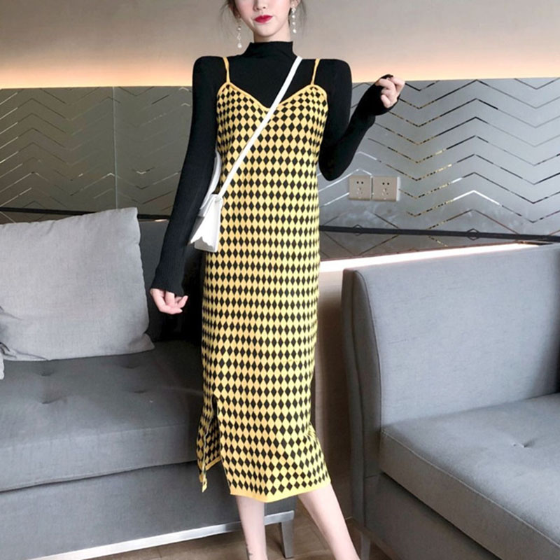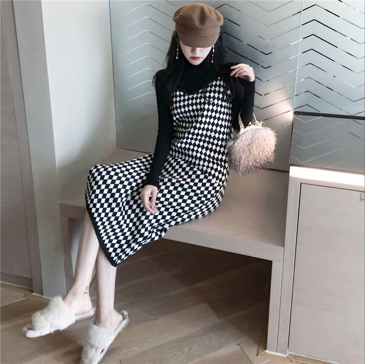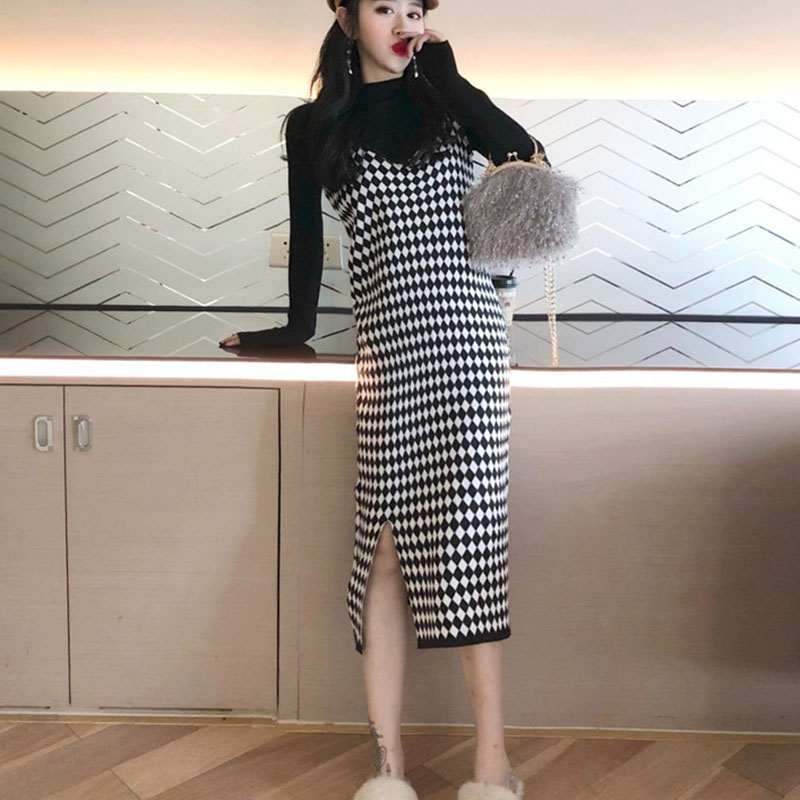/ 秋裝女2018新款套裝時尚中長款開叉格子吊帶長裙+打底衫兩件套潮