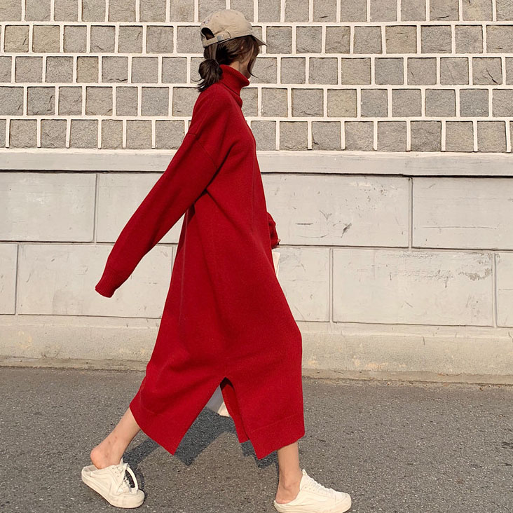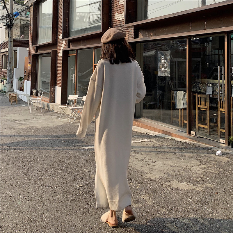 / 慵懶風套頭毛衣女2018新款秋冬韓版長款純色修身氣質開叉連衣裙女