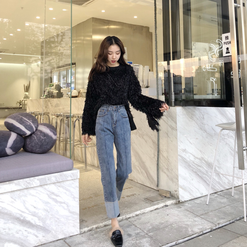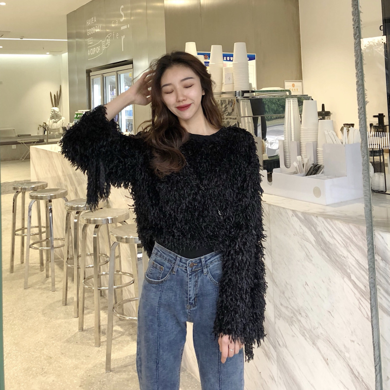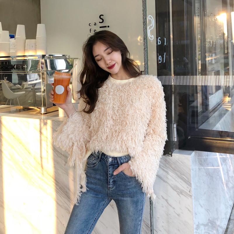 2018冬季新款韓版流蘇毛毛長袖寬松圓領百搭喇叭袖純色T恤女上衣