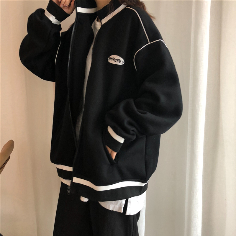 秋冬韓版中長款學院風慵懶風寬松加絨加厚拉鏈衛衣開衫上衣外套女