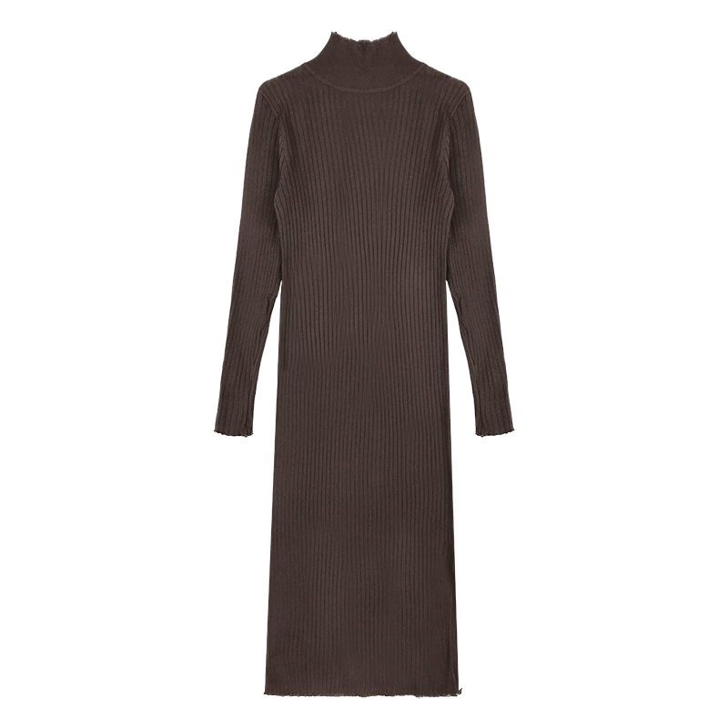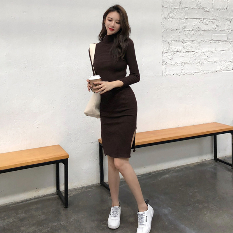 針織打底連衣裙女秋冬裝2018新款韓版中長款開叉修身顯瘦毛衣裙子