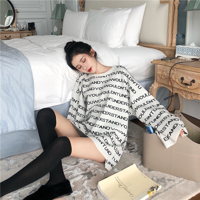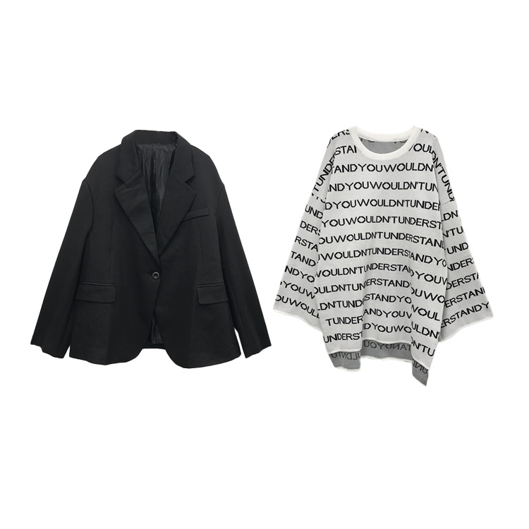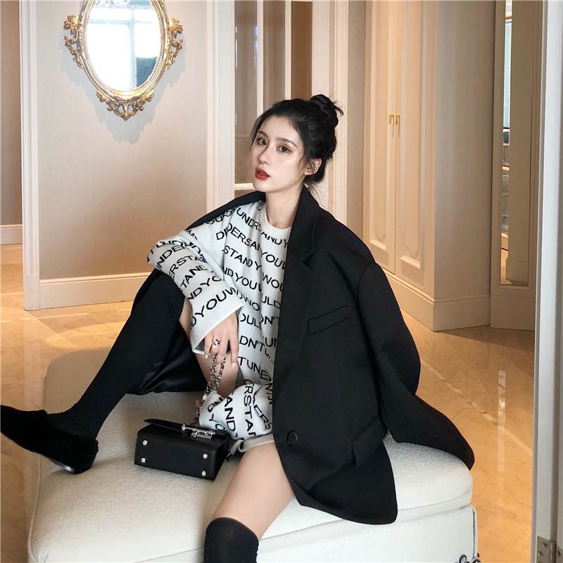 / 韓版秋裝女2018新款套裝字母套頭毛衣+黑色帥氣西裝外套兩件套潮