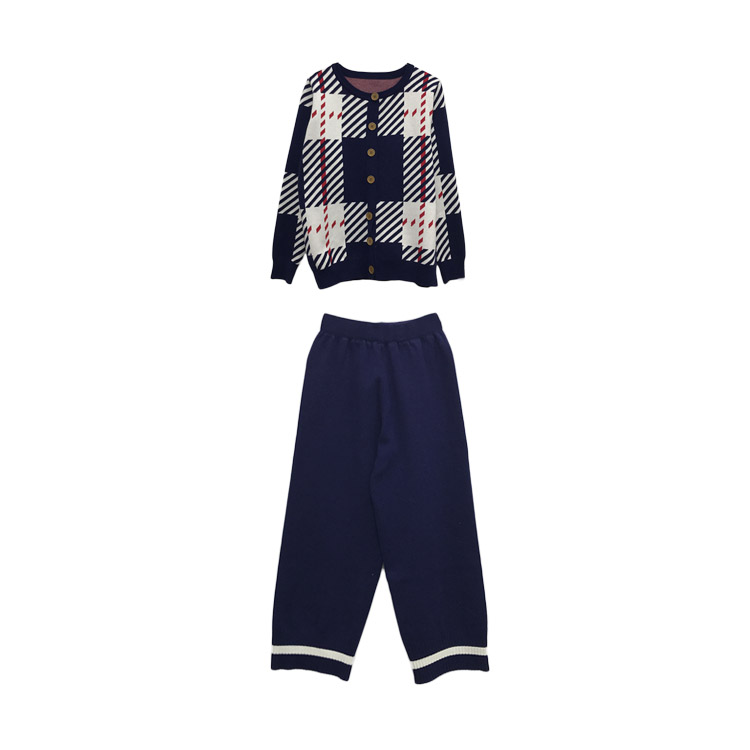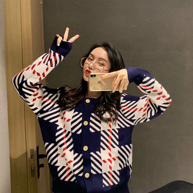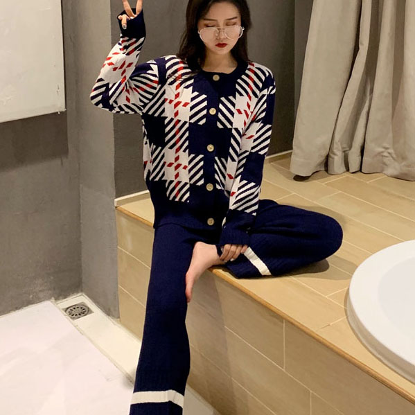 / 韓版秋裝女2018新款復古撞色格紋毛衣外套+寬松闊腿褲針織褲套裝