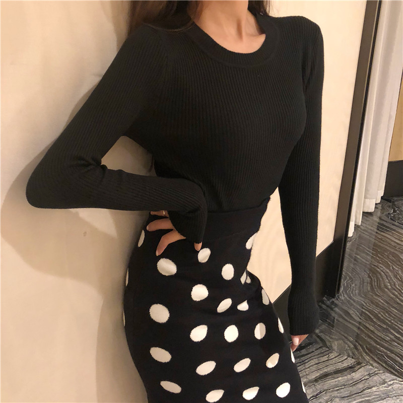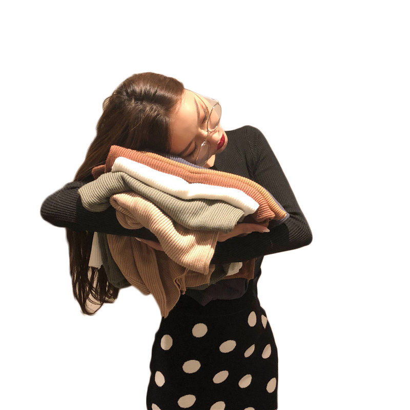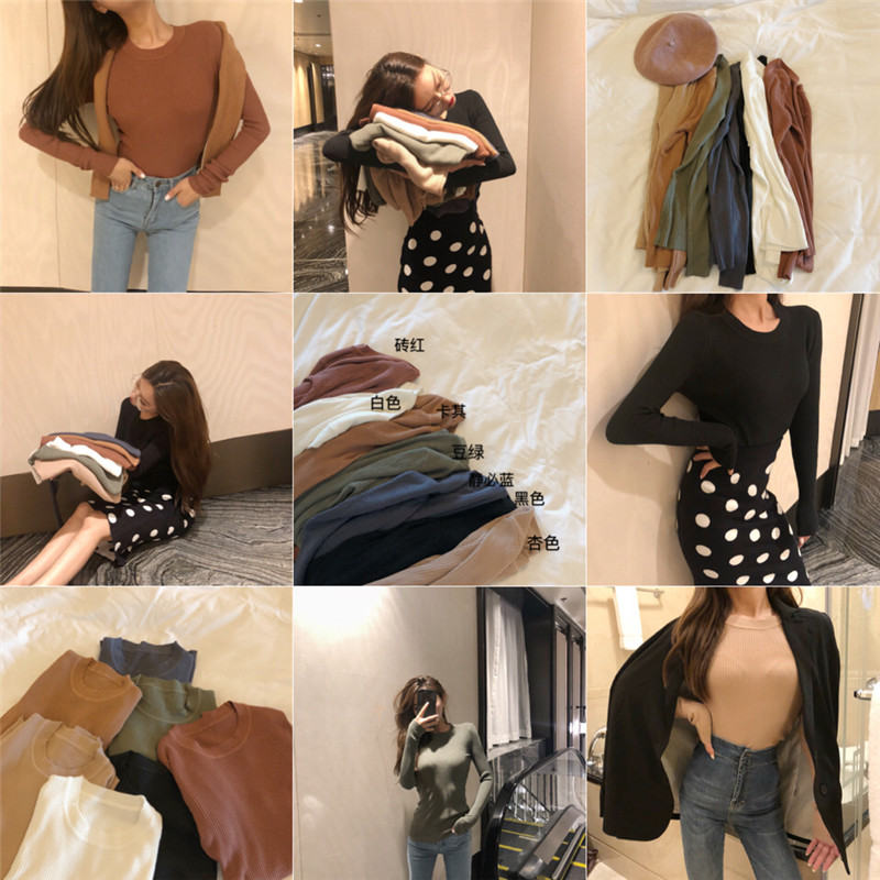 初秋溫柔風毛衣百搭純色修身顯瘦圓領緊身針織衫套頭長袖打底上衣