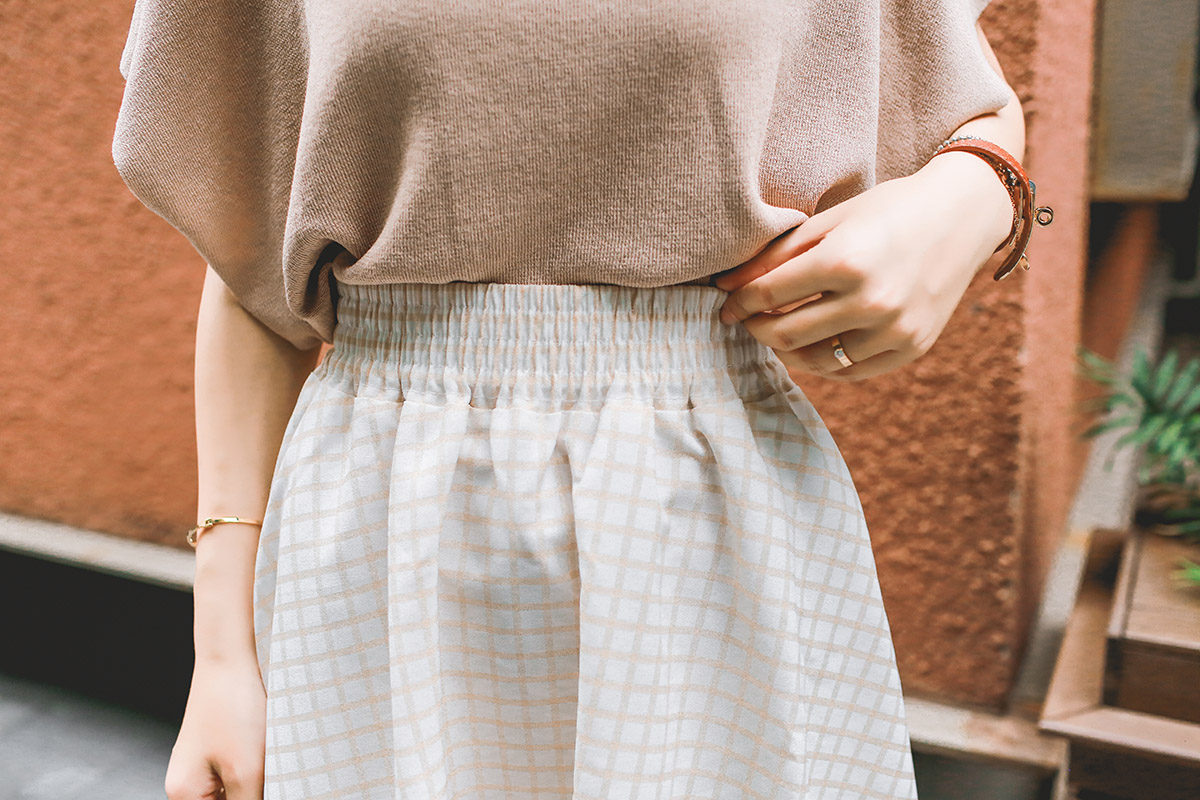 杏色 格子大擺裙521
