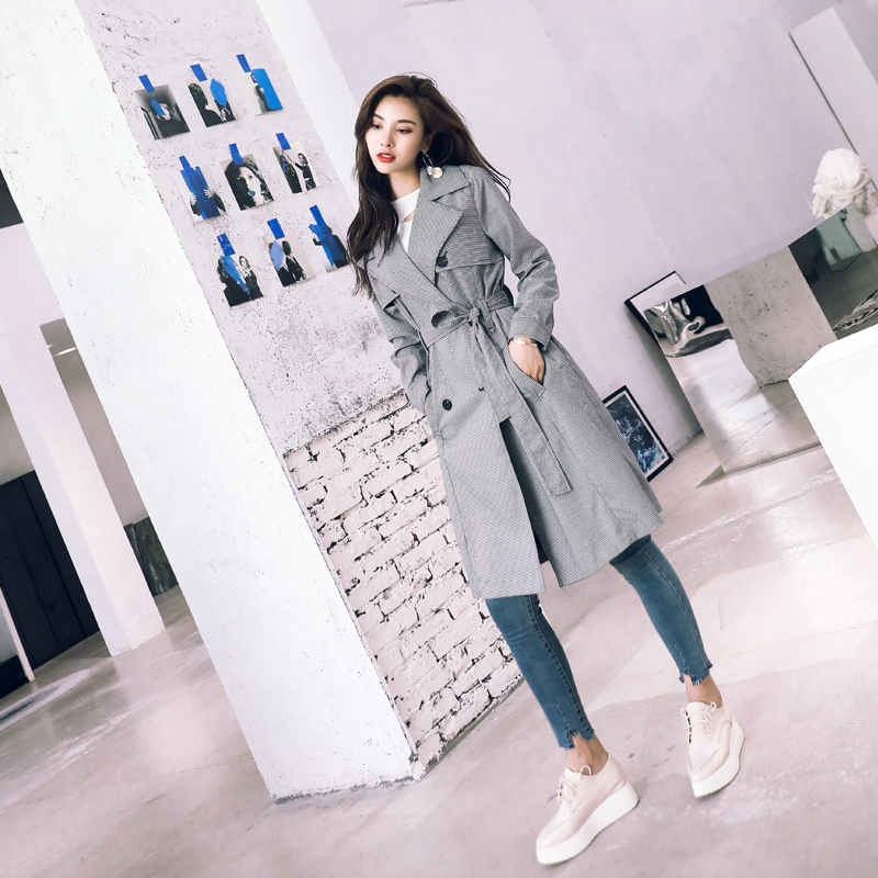 復古格子風衣女中長款2018春秋季新款韓版收腰顯瘦翻領外套大衣潮