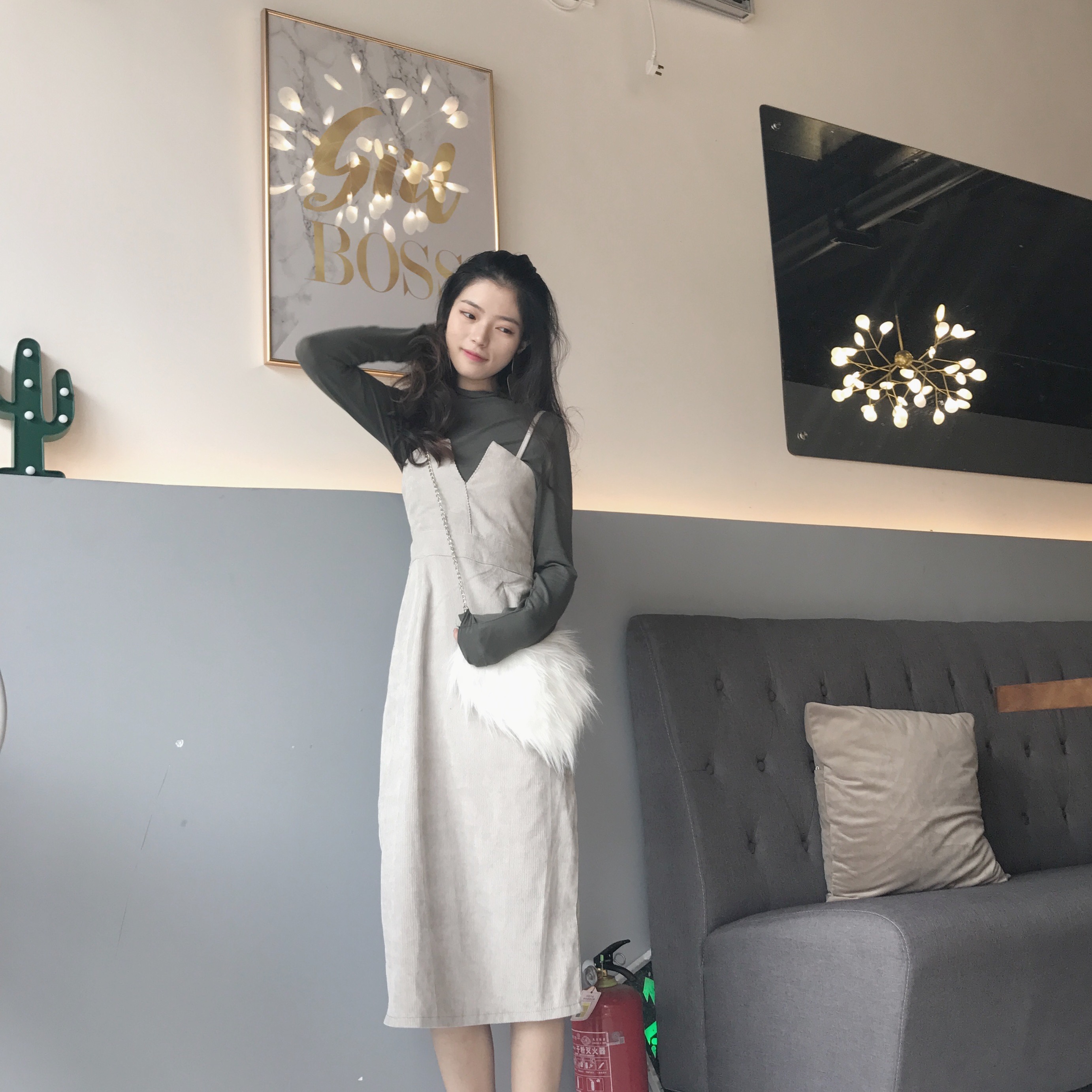 韓版修身復古中長款收腰燈芯絨吊帶連衣裙+黑色百搭高領打底衫潮