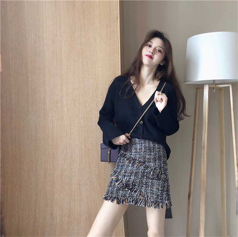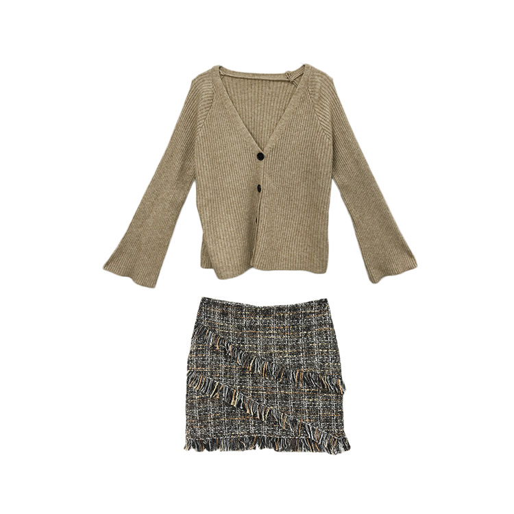 / 女神套裝秋裝2018新款V領喇叭袖毛衣針織開衫+粗呢高腰a字半身裙