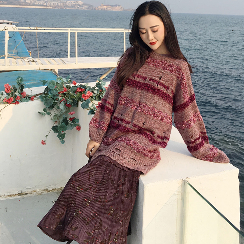 / 破洞毛衣慵懶風針織外套高腰顯瘦A字半身裙子時尚套裝女秋冬新款