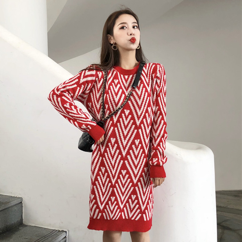 時尚撞色毛衣裙秋裝女2018新款法式少女茶歇裙圓領寬松長袖連衣裙