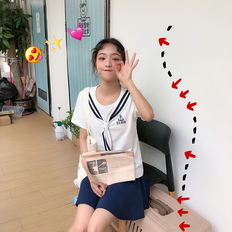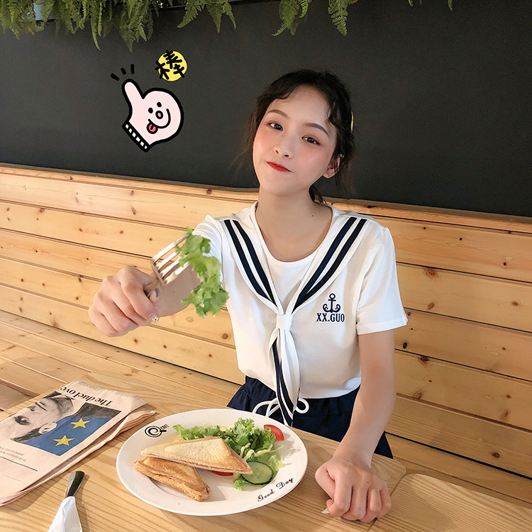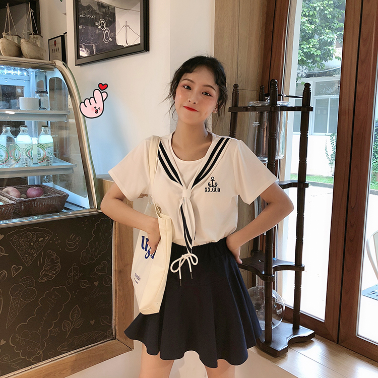 / 日系軟妹學院風套裝2019夏設計感海軍風上衣+高腰半身短裙ins班服
